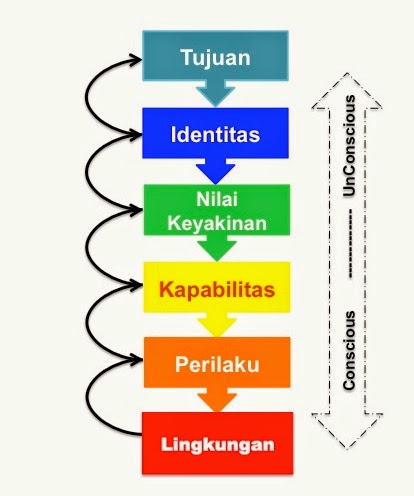 Sebaliknya level yang paling bawah yaitu lingkungan juga dapat memengaruhi level-level di atasnya. Prestasi Santi sebagai account manager di kota asalnya sangat signifikan. Ia dapat menjual melampaui target yang diberikan perusahaan tanpa kesulitan. Hal ini dapat dikatakan bahwa Santi dapat berperilaku efektif dan memaksimalkan kapabilitasnya di lingkungan tersebut. Begitu Santi dipromosikan dan ditempatkan di wilayah berbeda ia seperti kehilangan kemampuannya. Bagaimana dengan level-level lainnya seperti nilai-nilai dan keyakinan-keyakinannya, identitas dan tujuan? Santi mengalami konflik karena level-level tersebut tidak mudah mengalami perubahan atau penyesuaian dengan lingkung baru.